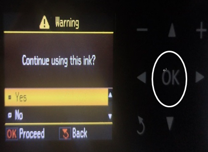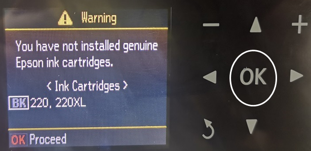 After installing the cartridge, you may receive the following message: You have not installed genuine Epson ink cartridges (or similar message). You can click ”OK”, and then click “Yes” as shown to bypass what printer indicates and use the cartridges directly.